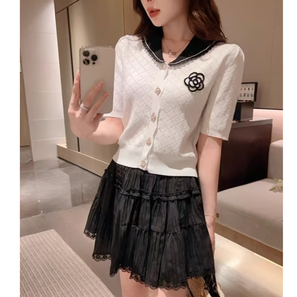CHANEL 샤넬 로즈꽃 배색 카라 니트