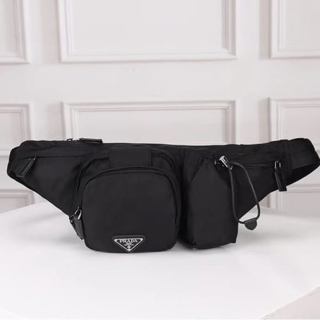 에나멜 처리된 프라다 로고로 장식된 기능성 패브릭 벨트 백. 전면과 상단에 1개씩 옆면에 1개씩 중앙에 큰포켓이 있으며 물통주머니가 있어 다용도로 활용가능합니다 측면 릴리즈 버클이 잠금 장치로 사용되었습니다.